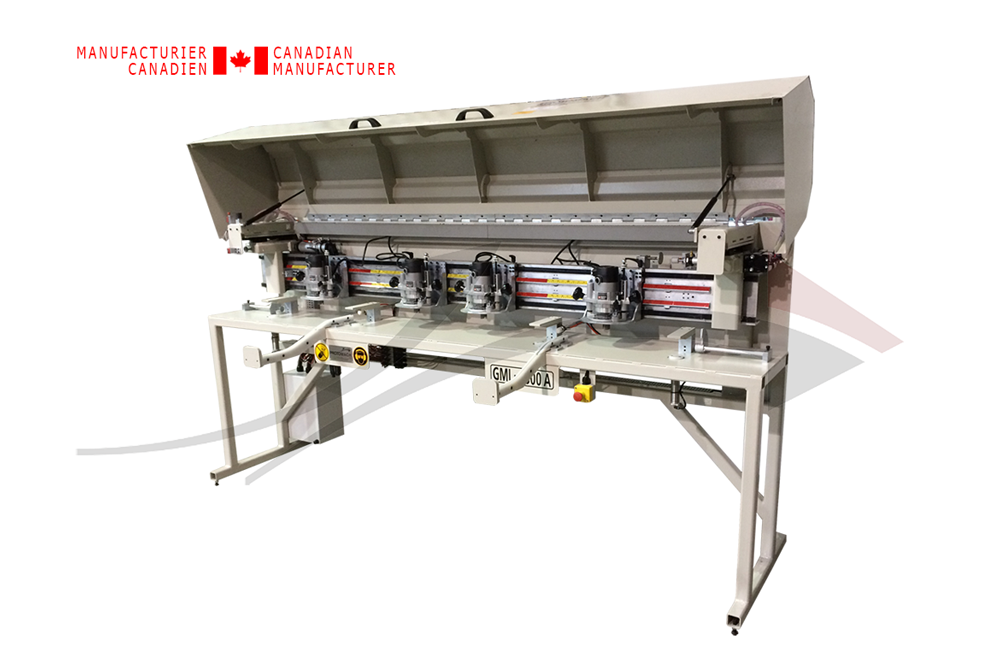 Machine à penture automatique à 4 têtes pour la préparation des cadres de porte standard et non standard. 4 toupies ajustables et rétractables, il est aussi possible d'utiliser chaque toupie individuellement.